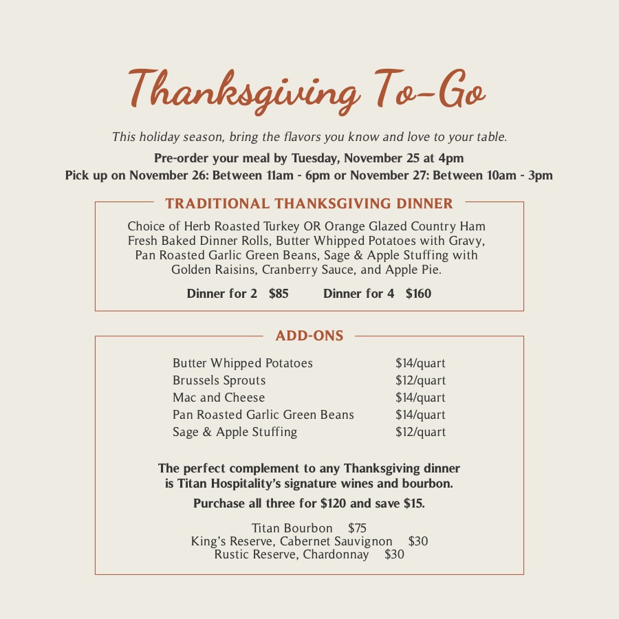 Herb Roasted Turkey, Baked Dinner Rolls, Butter Whipped Potatoes with Gravy, Pan Roasted Garlic Green Beans, Sage & Apple Stuffing with Golden Raisins, Cranberry Sauce, and Apple Pie